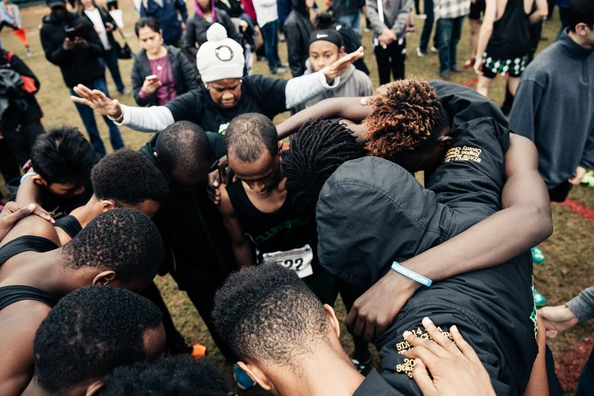 Fifty Nations Deep, Bitter Southerner refugee runners Clarkston cross country team huddle, editorial sports photographer, Growl, Atlanta, GA View fullsize